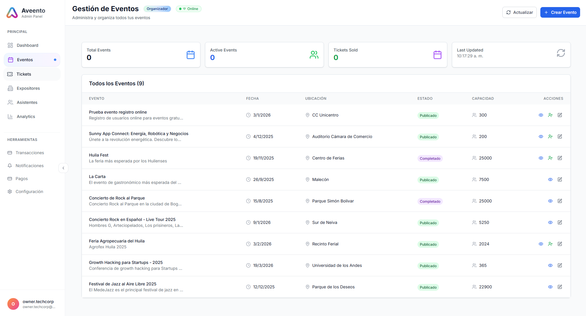 Gestión integral de eventos, tickets, asistentes y analytics en tiempo real con inteligencia operativa